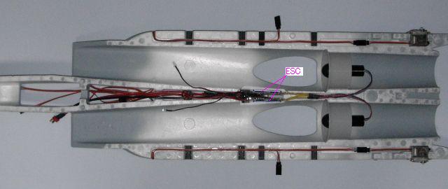 ESCは両ダクトの中央に取り付け、風が当たるようにしています。エルロンサーボ用の延長ハーネスも埋め込んでいます。EDFユニット2基とエレボン用サーボPARK