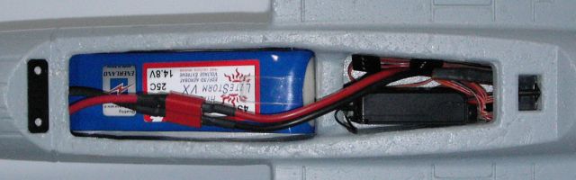 キャノピー部分に受信機とバッテリーを搭載しました。バッテリー下には空冷のための30mm×10mm程度の穴があります。