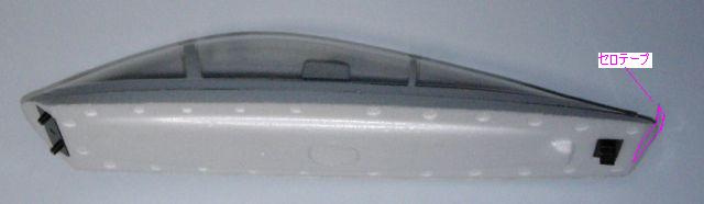 キャノピーの装着は前部分の凹凸を合わせ、後ろをパチッとはめるようになっています。取り外しを容易にするために図の赤線部分にセロテープを付けています。