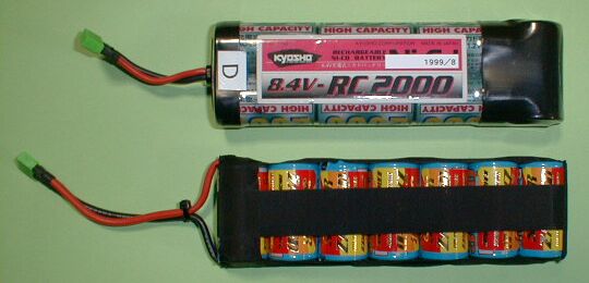 最近、ラジコン用のニッケル水素(Ni-MH)バッテリーが販売されています。パナソニック製Ni-MHバッテリー(SUPER ZAPPED)を使ってみましたので、従来から使用していたSANYO製Ni-Cdバッテリー(京商製RC-2000)と比べて見ます。 結論から先に言って、Ni-MHバッテリーは従来のNi-Cdバッテリーに劣らずとも優れているといえるでしょう。巷の噂では「Ni-MHバッテリーはパワーが出ない!」とか言われていますが、私が使用してみた感じでは、決してそのようなことは有りません。 テストは京商製電動ダクテッドファンF-16で行いました。静止状態フルパワー時で30Aほど流れます。 ニッケル水素バッテリーSUPER ZAPPED(写真下)