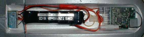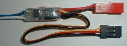![]() *バッテリー GWS製7.2V110mAh。コネクタはBEC。重量は43g *アンプ シュルツ製 slim-18beを使用。本体が軽いだけにリード線の重量が気になるので、できる限り短くする。 初フライトには、これより軽量な クラフトるーむ製SF-2を使用したが、2回目で調子が悪くなった。このアンプは、オートカットもブレーキも付いていない。slim-18beと比べ、SF-2を使用した場合、重量は1.5g程軽くなる。 クラフトるーむ製SF-2*受信機 JR製NER-649S(重量28g)。標準のケースを取り去り、代わりに薄いプラスチック板で作ったケースを使用した結果18gになった。 アンテナは標準のビニール電線(長さ90cm、重さ3g)を切り取り、自作の短縮アンテナ(重さ0.8g)を取り付けた。近距離で飛行さすので、多少の感度低下は問題なし。 *サーボ GWS製 NARO HP BB(重さ9g)を2個使用。初めて使ったサーボだが、軸のガタがほとんど無い、音はギャーギャーと不愉快、トルクは1.4kg-cm、スピードは0.11秒/60°と超高速だが(?)・・・確かに速い。 GWS製サーボ NARO